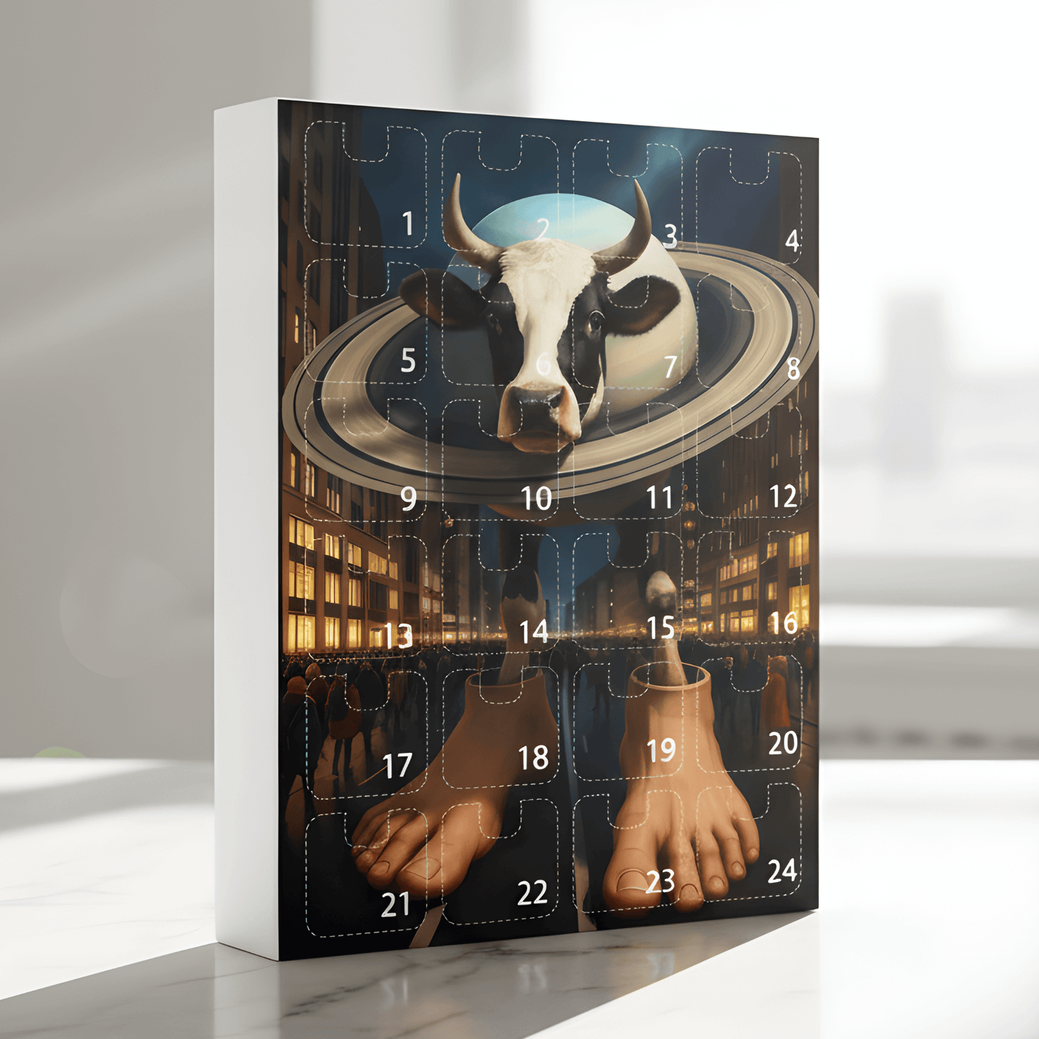 Den dekorativa boxen är designad med julmotiv och kan användas direkt som present eller placeras som del av juldekorationen. Luckorna är utformade för att hålla figurerna säkra tills de öppnas.